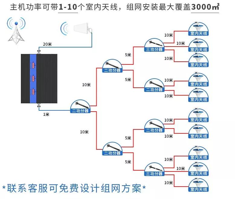 組網(wǎng)安裝最大可覆蓋3000平方,這里5層樓一共搭配10個(gè)室內(nèi)天線,每層安裝2個(gè)室內(nèi)天線就能深度覆蓋52個(gè)房間的信號問題。