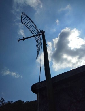 1、首先在室外或者樓頂找到空曠的位置,而且要信號相對好的方向安裝柵格天線;我們把天線用竹竿架高安裝,因為在山區(qū)地勢比較復(fù)雜,盡可能把柵格天線安裝高一點,這樣接收信號也穩(wěn)定一些。